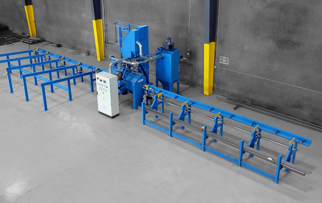 棒材拋丸機(jī)主要用于清理圓鋼、圓管、方鋼、鋼筋等型材,對(duì)工件表面進(jìn)行清理和強(qiáng)化,除掉其上的銹層、焊渣及氧化皮,使之獲得均勻一致的金屬光澤,以提高鋼材的涂飾質(zhì)量與防腐效果。公司針對(duì)用戶的生產(chǎn)狀況設(shè)計(jì)了兩款產(chǎn)品:?jiǎn)胃謇?strong>拋丸機(jī)和多根清理拋丸機(jī),這兩種棒材拋丸機(jī)都可以工件自動(dòng)裝卸,自動(dòng)化程度高,不需要人工搬運(yùn),提高生產(chǎn)效率,節(jié)約成本。為保證對(duì)清理工件的嚴(yán)格要求,我們?cè)谠搾佂铏C(jī)的方案和設(shè)計(jì)中采用下述關(guān)鍵技術(shù)及保證措施: