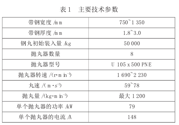熱軋硅鋼帶在進(jìn)行冷軋以前,一定要進(jìn)行酸洗。酸洗的目的是除鱗、去氧化層。對硅鋼帶,一般采用拋丸酸洗法。拋丸的目的是對帶鋼表面進(jìn)行連續(xù)除鱗,帶鋼表面經(jīng)丸粒連續(xù)打擊,使表面氧化鐵皮松落,從而提高酸洗效果。首鋼某常化酸洗機(jī)組用于為下游的二十輥機(jī)組提供合格的原料鋼卷,主要生產(chǎn)無取向高牌號硅鋼和取向硅鋼,該機(jī)組在其酸洗槽入口設(shè)置了拋丸機(jī),該拋丸清理機(jī)是由 DISA 公司設(shè)計(jì)制造。以下主要對拋丸機(jī)的設(shè)備結(jié)構(gòu)進(jìn)行分析。